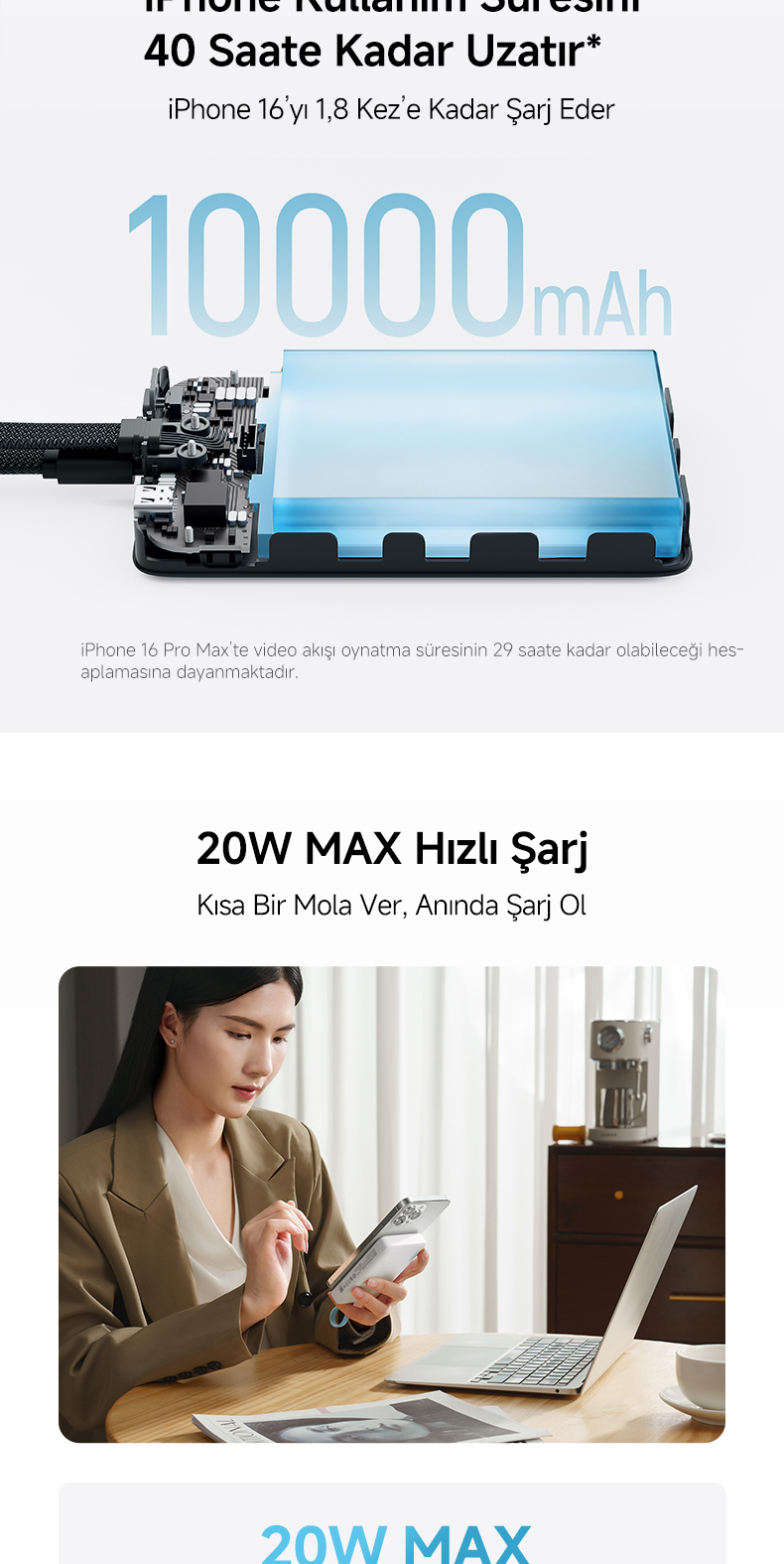 Kabloya ihtiyaç duymadan güvenli ve verimli şarj deneyimi sunarken, 10.000 mAh kapasitesiyle gün boyu enerji sağlar.