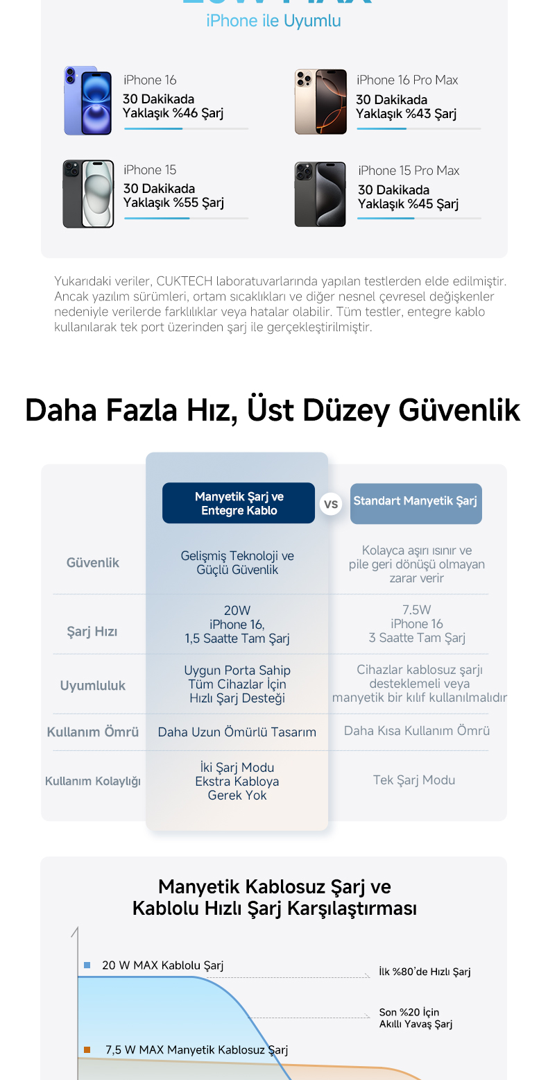 • iPhone 12/13/14/15/16/17 serileri: MagSafe hizalama ve 20 W hızlı kablosuz şarj