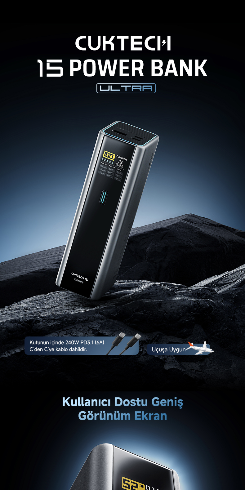 CUKTECH 15 Ultra Powerbank 20000 mAh | 210 W Toplam Çıkış | 165 W Beast Mode | PD 3.1 | TFT Ekranlı Taşınabilir Şarj Cihazı