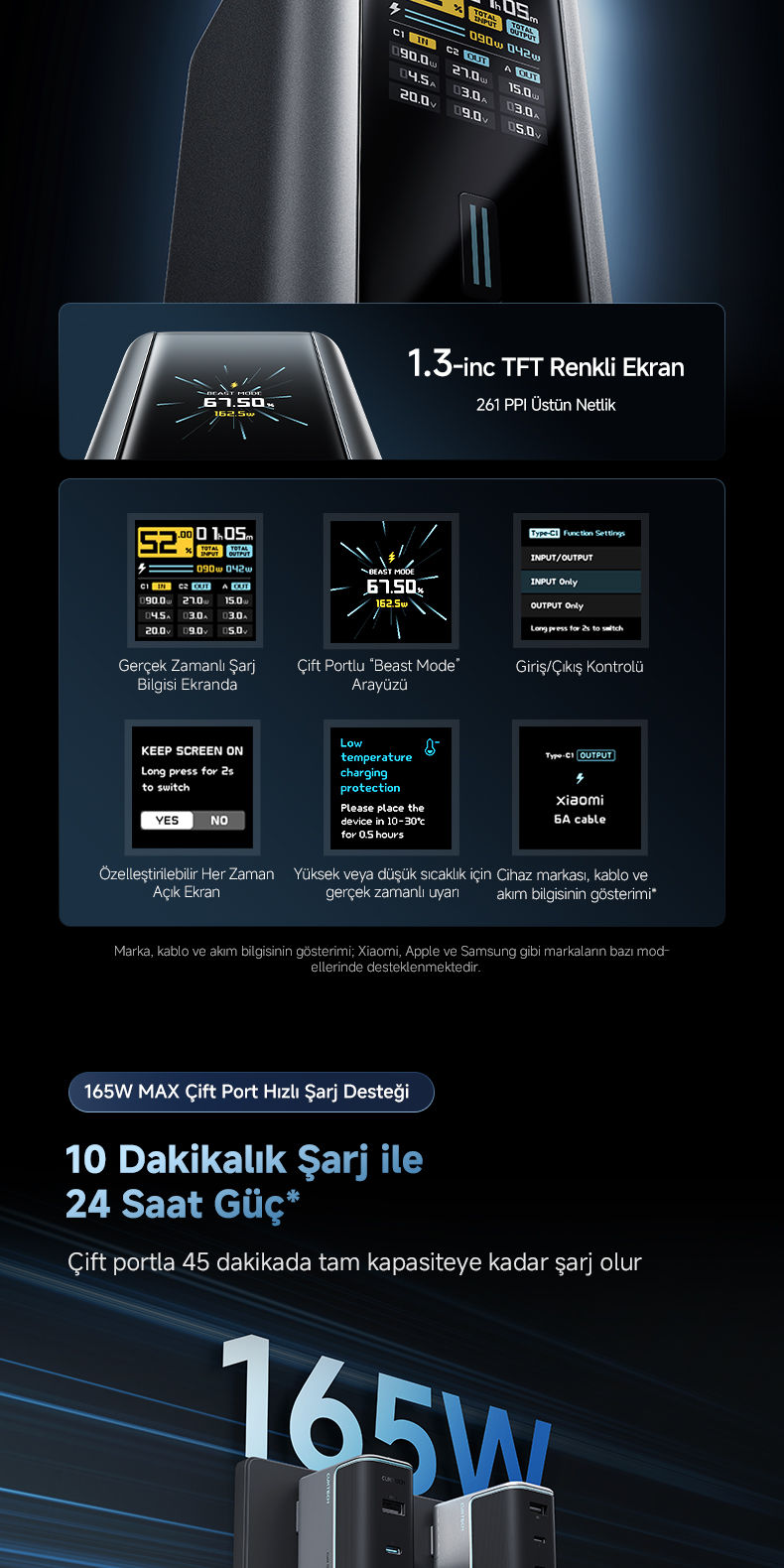 165 W giriş gücü sayesinde yalnızca 20 dakikada %70 seviyesine ulaşır ve 1 saatte yeniden tam dolum sağlar.