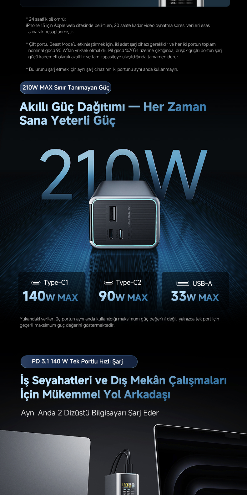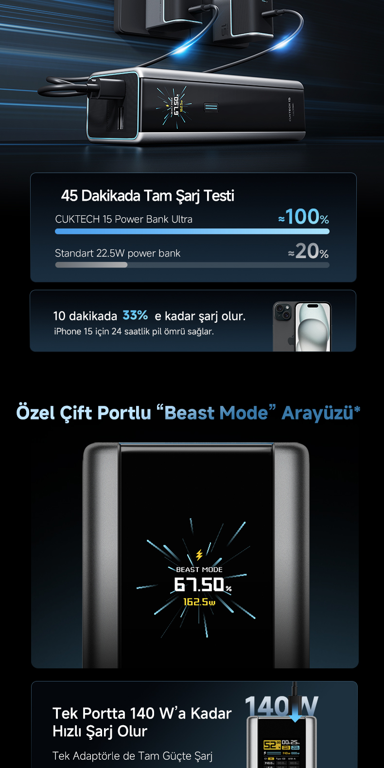 165 W “Beast Mode” kendi şarj kapasitesi, 210 W toplam çıkış gücü ve 20.000 mAh batarya kapasitesiyle, sınıfındaki en güçlü taşınabilir şarj cihazlarından biridir.