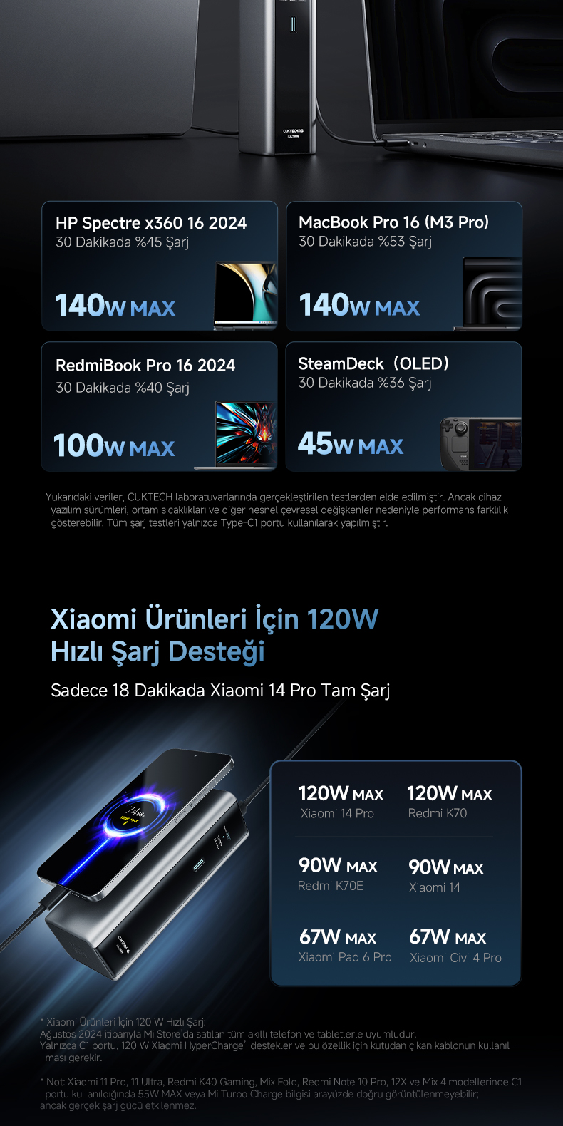 CUKTECH 15 Ultra, PD 3.1 standardıyla donatılmıştır ve tek portta 140 W, toplamda 210 W’a kadar çıkış gücü sunar.