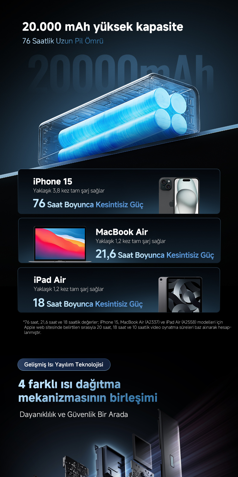 Bir MacBook Air’i %100, iPhone 15 Pro Max’i ise yaklaşık 3,5 kez şarj edebilir.