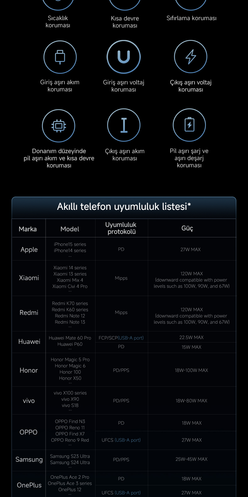 Aşırı akım, kısa devre, aşırı ısınma ve gerilim dengesizliğine karşı dokuz katmanlı güvenlik sistemiyle korunur.