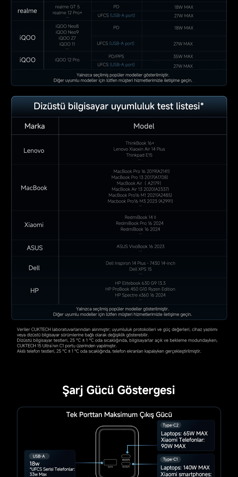 CUKTECH 15 Ultra; PD, PPS, QC, FCP, SCP, MiPPS protokollerini destekler.