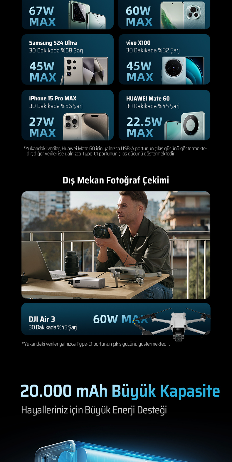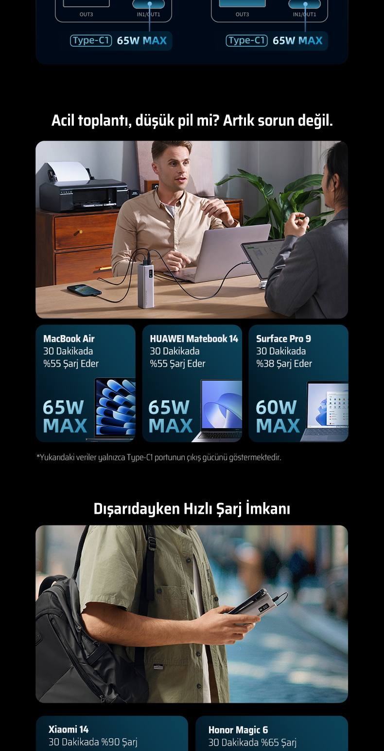- Powerbank kendisi de hızlı şekilde şarj olur (65 W Type-C giriş)