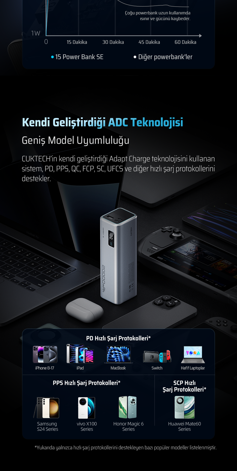 CUKTECH 15 SE Powerbank, 85 W’a kadar toplam çıkış gücü ve gelişmiş PD3.1 hızlı şarj teknolojisiyle, laptoplardan akıllı telefonlara kadar tüm cihazlarınız için güvenli ve verimli enerji sağlar.