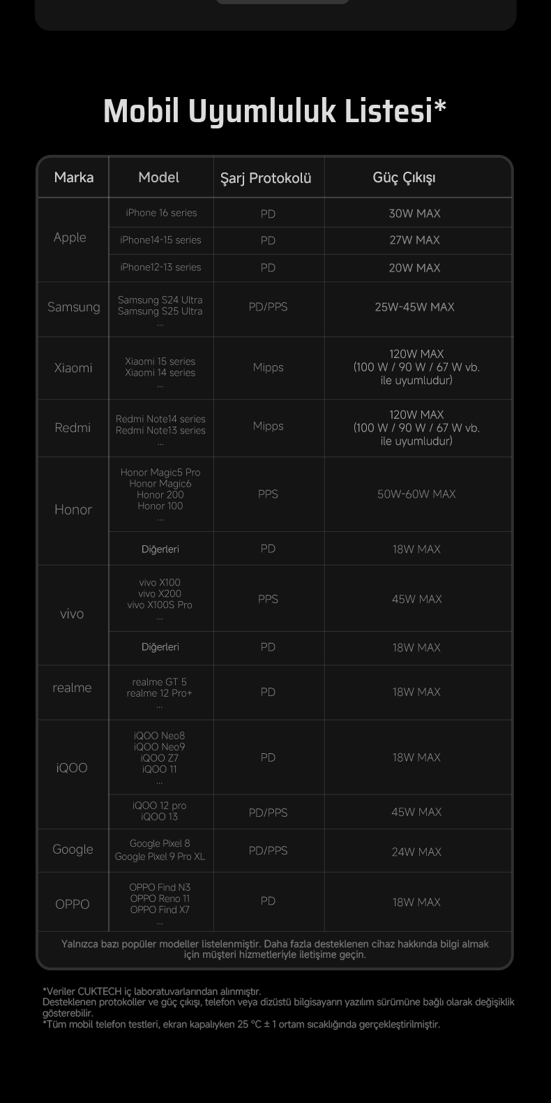 - PD3.1 / PPS / QC / SCP / UFCS hızlı şarj protokollerini destekler